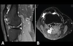 Figura 53. Corte de secuencia sagital (A) y axial (B) T2 Fat-Sat de RM de rodilla: lesiones osteocondrales en el fémur y la rótula.