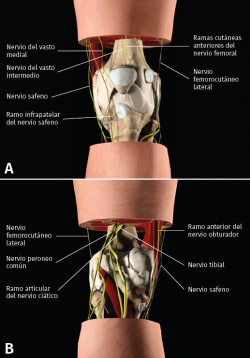b) Ramos cutáneos terminales: los ramos medial, intermedio y lateral forman parte del plexo patelar mencionado previamente. El ramo medial forma, junto con una rama del safeno y obturador, otro plexo que inerva la cara interna de la rodilla.