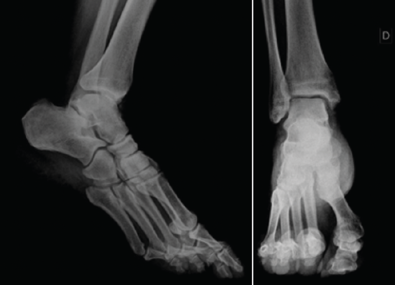 Se presenta el caso de un paciente varón de 54 años de edad, de profesión repartidor, que refiere una caída desde la plataforma de un camión, con torsión del tobillo derecho. Acude deambulando con la ayuda de un bastón. A la exploración física del tobillo derecho, presenta un balance articular disminuido con respecto al contralateral. Muestra dolor difuso a la palpación del ligamento peroneoastragalino anterior y posterior, y en la cúpula astragalina en la cara anterior del tobillo. No presenta dolor a la compresión de la sindesmosis. No da impresión de inestabilidad con maniobras de varo/valgo. En la radiografía se descartan fractura o signos indirectos de lesiones de partes blandas (Figura 1).