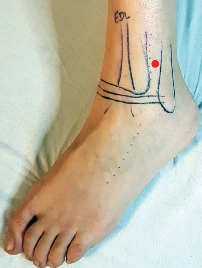 No obstante, sabemos que no podemos concluir que este tipo de abordajes no esté exento de riesgos ni complicaciones. La lesión neurológica a evitar por este portal es principalmente la del nervio peroneo superficial y sus ramas. Son las estructuras que más riesgo de complicaciones tienen en la artroscopia de tobillo por su alta variabilidad(6); en cuanto a las estructuras vasculares en riesgo, debemos tener en cuenta que se han descrito desviaciones laterales de la arteria tibial anterior, emplazándose en frente de la sindesmosis en el 5,5% de los pacientes(7). Por ello, recomendamos el estudio Doppler antes de plantearnos la realización de dicho portal.