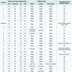 En cuanto a los factores de riesgo cardiovascular (FRCV), del total de la muestra, 10 pacientes presentaban algún tipo de FRCV, siendo 4 de ellos sujetos con más de un FRCV concomitante en el momento de la lesión. Respecto a los hábitos tóxicos, 5 de ellos resultaron fumadores y 3 bebedores de alcohol ocasional (Tabla 2).