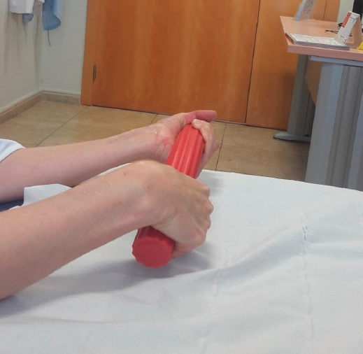 Figura 1. Ejercicio excéntrico con goma elástica. Primera fase: la paciente sujeta en la mano afectada (derecha) un rulo elástico envuelto con cinta elástica en posición neutra. La goma está sin tensión, pero actúa una fuerza isométrica sobre la musculatura excéntrica.