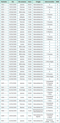 En 26 casos se realizaron interconsultas a especialistas, 128 en total, fundamentalmente a Traumatología (72) y Cirugía Plástica (37). 2 pacientes requirieron atención psicológica, y en 8 casos consta “consulta a especialista” sin otra especificación. Sólo se reflejan, a efectos contables, las consultas o actuaciones externalizadas ya que las propias no generan gastos adicionales. En cuanto a la rehabilitación, las sesiones en clínicas propias quedan registradas, en tanto que las externalizadas únicamente figuran en facturación. Así, los 15 casos con 0 sesiones muy probablemente sea por este motivo, si bien, por la incertidumbre, se excluyen, resultando que los 27 pacientes restantes, realizaron entre 5 y 119. Eliminando a este último paciente para evitar el sesgo, el promedio ha sido de 24 días (Figuras 5 y 6).