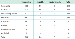 De los 1.395 accidentes de tráfico analizados en el presente estudio, en el 58,4% de los casos los lesionados se consideraron no culpables del suceso (815 casos), mientras que en el 36,1% se consideraron culpables de él (503 casos). El 5,5% de los casos restantes (77 casos) se consideraron indeterminados (Tabla 1).