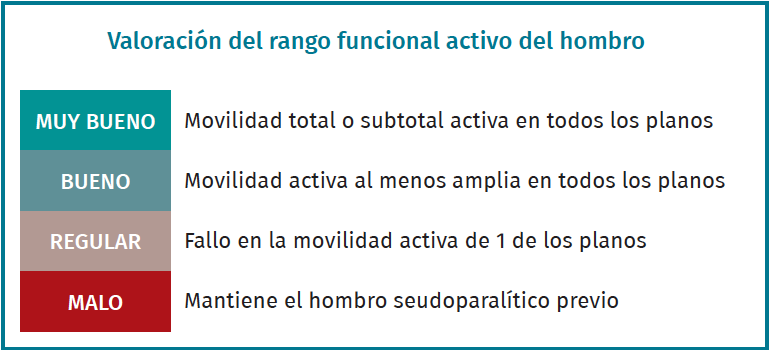 Figura 2. Descripción de la estratificación cualitativa realizada en nuestro estudio del rango articular activo del hombro intervenido al final del seguimiento.