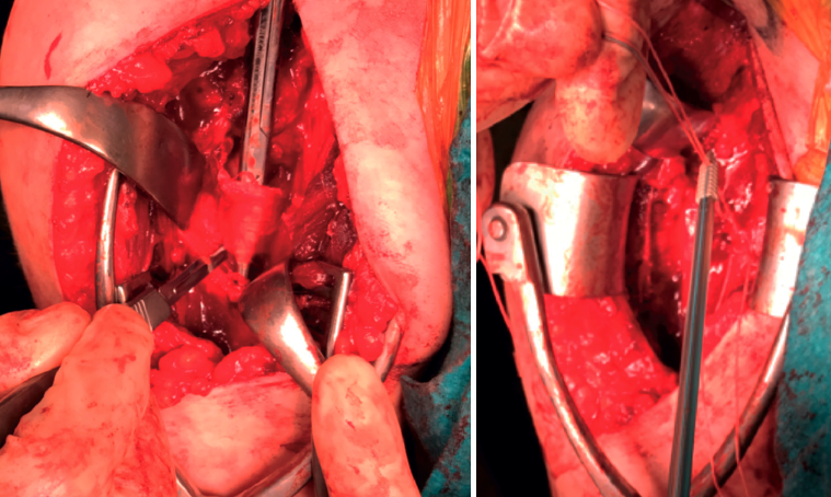 Figura 7. En la izquierda: vía deltopectoral convencional, donde se aprecia en detalle el tendón del dorsal ancho localizado y preparado para su desinserción. En la derecha: detalle de la fijación del dorsal ancho en el troquín mediante anclajes convencionales de artroscopia de hombro.