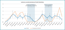 En cuanto a las temporadas de fútbol 2019-2020 y 2020-2021, a causa de la pandemia decretada por el virus de la COVID-19, la participación en el fútbol catalán se vio afectada en distintos periodos de tiempo. Específicamente, tanto los entrenamientos como las competiciones fueron suspendidas entre los meses de marzo de 2020 y junio de 2020. Por otro lado, en Cataluña se suspendieron las competiciones entre los meses de noviembre de 2020 y febrero de 2021, aunque los entrenamientos estuvieron permitidos. La Figura 2 muestra el análisis de la comparación de la incidencia lesional entre la media anual (excluyendo las temporadas 2019-2020 y 2020-2021) y la incidencia en las temporadas 2019-2020 y 2020-2021.