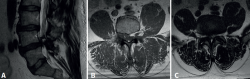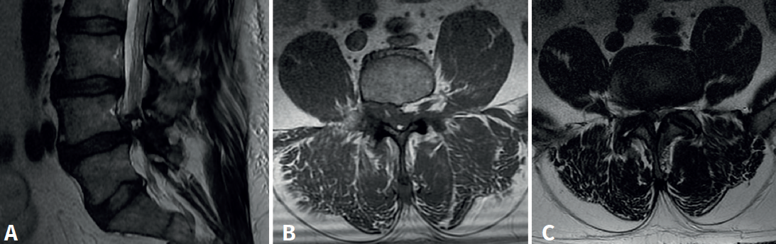 Se trata de un varón de 57 años, empleado en recogida de basura. Diez días antes de la consulta sufre una caída accidental con dolor intenso en el miembro inferior izquierdo, hipoestesia en calcetín y debilidad para la flexión y extensión del tobillo. En la exploración física presentaba Lasègue izquierdo negativo, derecho positivo a 50° y femoral stretch test derecho positivo. Se constató fuerza 1/5 en el tobillo izquierdo. La resonancia magnética (Figura 1) mostró discopatía L4-L5 con hernia discal posteromedial derecha. La electromiografía (EMG) evidenció afectación radiculoplexular izquierda moderada L3-L4 y grave L5-S1 posganglionar.