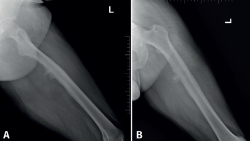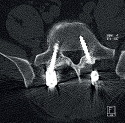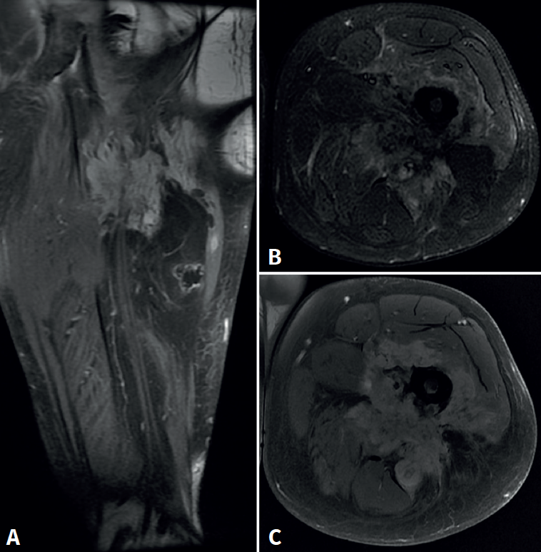 Cincuenta días tras el accidente se realizó fusión lumbar instrumentada L4-L5 con inserción de dispositivo intersomático por vía transforaminal derecha. En el segundo día postoperatorio presentó empeoramiento del dolor, objetivándose en la tomografía computarizada (Figura 2) malposición del tornillo L5 izquierdo que invadía el canal. Se reintervino a los 5 días corrigiendo el trayecto del tornillo. Sin embargo, persistió el dolor. La revaluación del caso, sumada a los hallazgos de EMG, motivó estudios complementarios de pierna y trayecto ciático (Figuras 3 y 4), detectándose una masa tumoral en el fémur izquierdo compatible con sarcoma fusocelular.