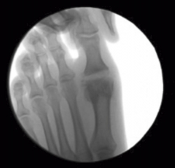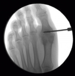 La posición de la artrodesis se determina utilizando la proyección de perfil con el Fluoroscan®, para evitar subluxaciones de la misma. Es con la visión de perfil cuando se colocan las agujas de Kirschner para los tornillos canulados y, después, se comprueba que la posición es correcta con la visión de frente. De forma percutánea, se colocan 2 agujas de Kirschner, una desde la primera falange y otra desde el metatarsiano en forma de X, cruzándose al nivel de la articulación (Figura 4). Es útil comprimir los dos huesos con la mano mientras se pasan las agujas.