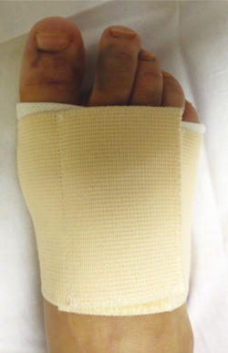 A los 10 días, se retira el vendaje posquirúrgico y se coloca una banda metatarsal que tiene un velcro que permite apretar o aflojar según el edema del pie (Figura 6). Esta faja metatarsal proporciona estabilidad a la artrodesis y el paciente es autorizado a realizar carga completa con el zapato ortopédico y la faja hasta las 5 semanas.